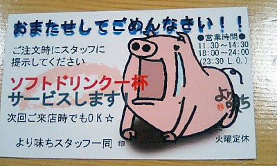 つくばのお好み焼き屋「より味ち」さんサービス券です。